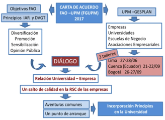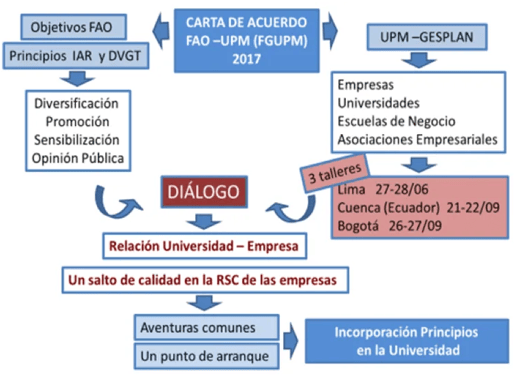 Se realizaron en colaboración con la Agencia Nacional de Tierras (ANT), con la participación de la Universidad Autónoma de Villavicencio, la Universidad Agraria de Colombia (UNIAGRARIA), la Universidad Autónoma de Cartagena, la Universidad Santo Tomas, Universidad UNIMINUTO y Universidad Autónoma De Nariño, la Universidad Politécnica Salesiana de Ecuador (UPS), la Asociación Nacional de Usuarios Campesinos de Colombia (ANUC), la Asociación de Pequeños y Medianos Productores Agropecuarios del Guejar (ASOPROGUEJAR) y la Empresa Alquería. Las jornadas-taller se denominaron “El papel de la Universidad en la Gobernanza responsable de la tenencia de la tierra para el desarrollo rural sostenible: hacia nuevas alianzas Público-Privadas”, y se celebraron en Bogotá durante los días 26 y 27 de septiembre del 2017. Entre las asociaciones participantes destacaron las mesas campesinas del Nariño, del Cauca y la agroecológica del Tolima, y de la ANUC – Asociación Nacional de Usuarios Campesinos. Movimientos que nacen a raíz de la exclusión del campesino en el país y en busca de defender sus derechos como personas y sobre sus tierras, los cuales han sido vulnerados durante la historia de Colombia.