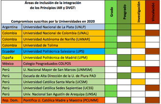 Quince universidades de siete países – Perú, Colombia, Ecuador, Argentina, México, República Dominicana y España –suscribieron un Acuerdo conjunto para insertar los Principios IAR en las actividades que les son propias: docencia de grado, docencia de posgrado, investigación y extensión. Estos desarrollos académicos quedaron reflejados en el Acta de Compromiso Conjunto firmadas por los responsables académicos competentes en Lima el día 19 de Octubre de 2018.