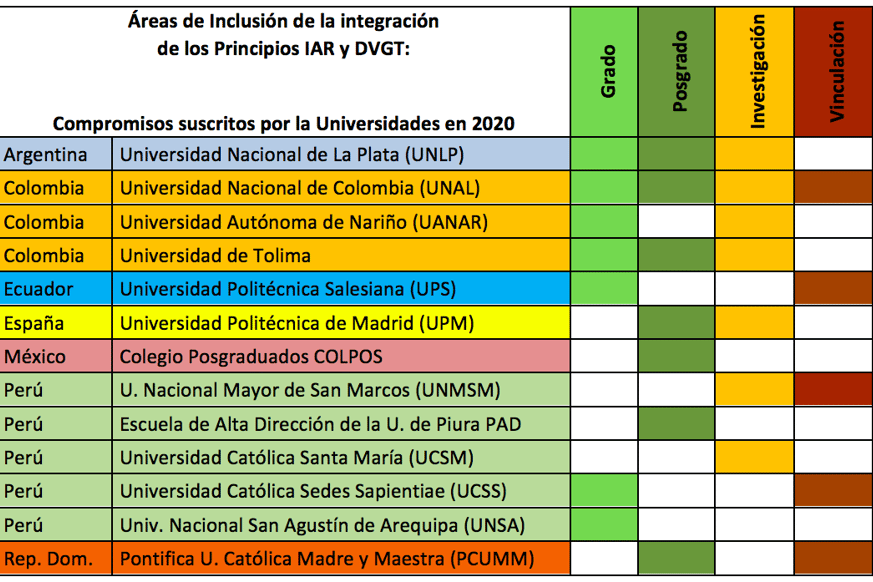 Con lo descrito más arriba y con la labor de ir permeando este conocimiento a lo largo de 2017 con las Jornadas que se organizaron en Lima y en Bogotá se incorporaron, a las universidades ya mencionadas: la Universidad Nacional de la Plata (Argentina), la Universidad Autónoma de Nariño de Colombia, el Colegio de Posgraduados de México, la Universidad Nacional Mayor de S Marcos decana de América, la Universidad de Piura y la Universidad Católica Santa María de Arequipa estas tres últimas de Perú [4].
