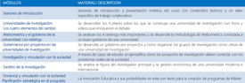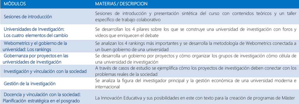 El contenido del programa formativo incluye en cada uno de sus módulos tanto aspectos teóricos como prácticos y talleres. La temática del curso cubre las tres dimensiones de la Gobernanza de las Universidades de Investigación