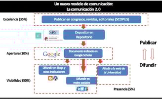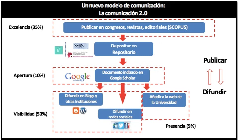 El modelo tradicional de la comunicación científica se basa en la publicación de artículos de investigación en revistas, libros en editoriales y comunicaciones en congresos y posterior difusión mediante documentos indizados a bases de datos no abiertas. En muchos casos, no se hace difusión a través de internet (web de la universidad, RRSS, etc.) de la producción científica, minorando mucho su impacto en la sociedad y la vinculación con la misma.