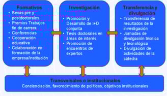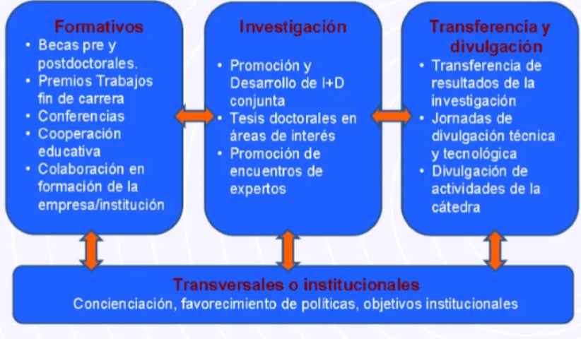 Las Cátedras y Aulas Universidad-Empresa son un instrumento para establecer una colaboración estratégica y duradera entre la Universidad y una empresa o entidad, con el fin de llevar a cabo actividades de formación, investigación y desarrollo o transferencia de conocimientos en un área de interés común. La empresa dota la cátedra con un financiamiento anual estándar pactado para realizar un plan de actividades. La universidad pone los medios humanos y espacios requeridos para la actividad. En algunos casos se utiliza el término Aula Universidad-Empresa para referirse a las colaboraciones de menor financiación anual y duración, pero el concepto es el mismo.