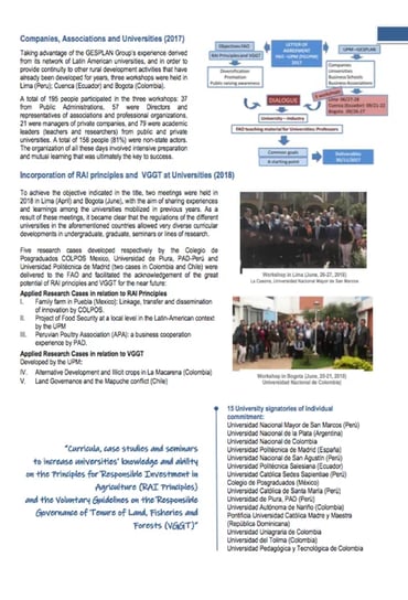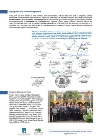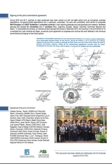 1. Resumen en inglés (enlace de descarga) y en castellano (enlace de descarga) y del trabajo realizado en los años 2016-2017-2018 y termina ese documento con la foto de familia del Acto de clausura y firma por parte de 15 universidades comprometiéndose a incorporar en su curricula académica los principios IAR y la DVGT (Directrices Voluntarias de Gobierno de la Tierra).