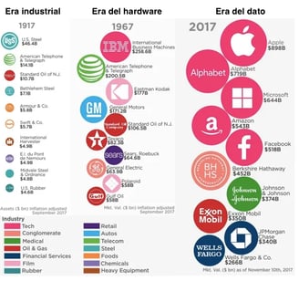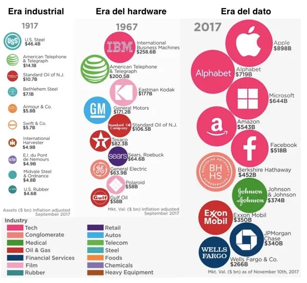 Así, la evolución del valor bursátil de las empresas es un reflejo de la innovación y de la adaptación al cambio. Como puede verse en la imagen de abajo, los sectores más valiosos han cambiado desde la primera revolución industrial. Hemos pasado del dominio de los sectores industriales, cuya materia prima eran los recursos naturales (carbón, acero, petróleo,...) a un liderazgo aplastante del sector tecnológico, cuya materia prima son los datos.