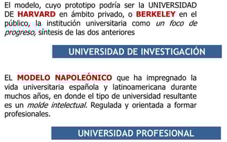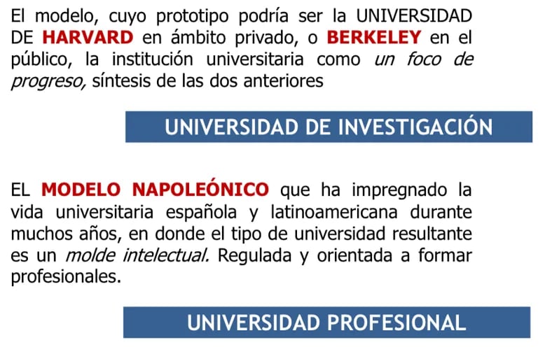 Una síntesis que podría hacerse y que se adelanta aquí es que el concepto universidad profesional , tan presente prácticamente en muchísimos países, tiene su inicio en un momento determinado en la segunda mitad del siglo XIX y vinculado a las repercusiones conceptuales fruto de la revolución francesa. En cambio, otros sistemas universitarios siguieron con un enfoque de universidad más centrada en su papel de creador de conocimiento y de difusión a través de una docencia siempre innovadora. Es el caso del ámbito anglosajón y alemán que presenta un desarrollo síntesis de los dos en el modelo norteamericano.