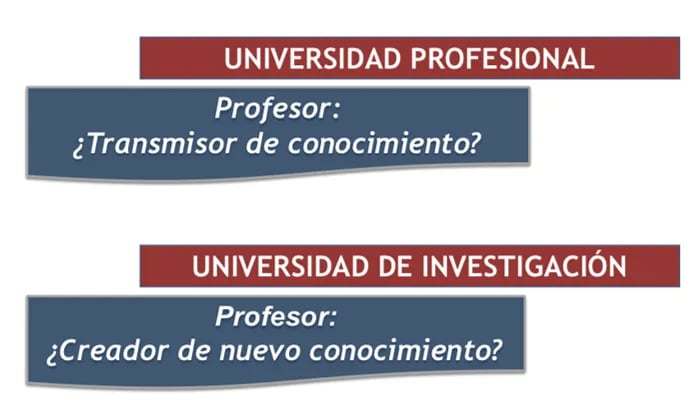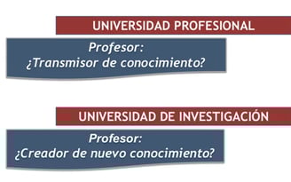 Es claro que puede haber profesores “transmisores” en universidades de investigación y profesores “creadores” en universidades profesionales pero siempre en uno u otro caso serán una minoría porque el gobierno de esas universidades es el que marca la pauta de uno u otro estilo y este estilo de gobierno hará fácil o difícil según los casos se profesor de un tipo u otro.